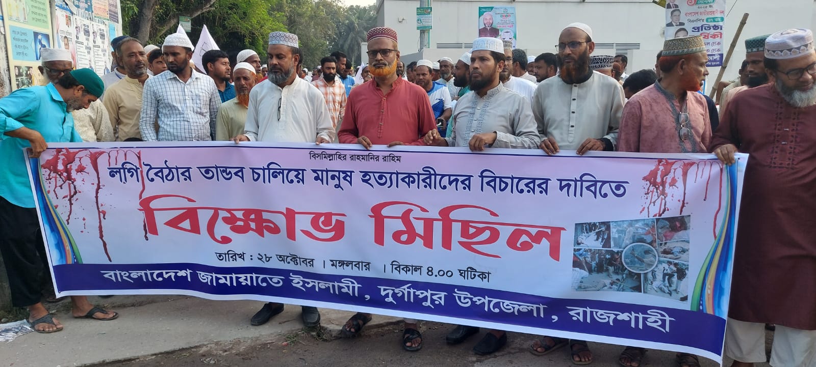 রাজশাহীর দুর্গাপুরে লগি-বৈঠার তান্ডব চালিয়ে নিরীহ মানুষ হত্যাকারীদের দ্রুত বিচারের দাবিতে বাংলাদেশ জামায়াতে ইসলামী’র উদ্যোগে এক বিক্ষোভ মিছিল অনুষ্ঠিত হয়েছে।