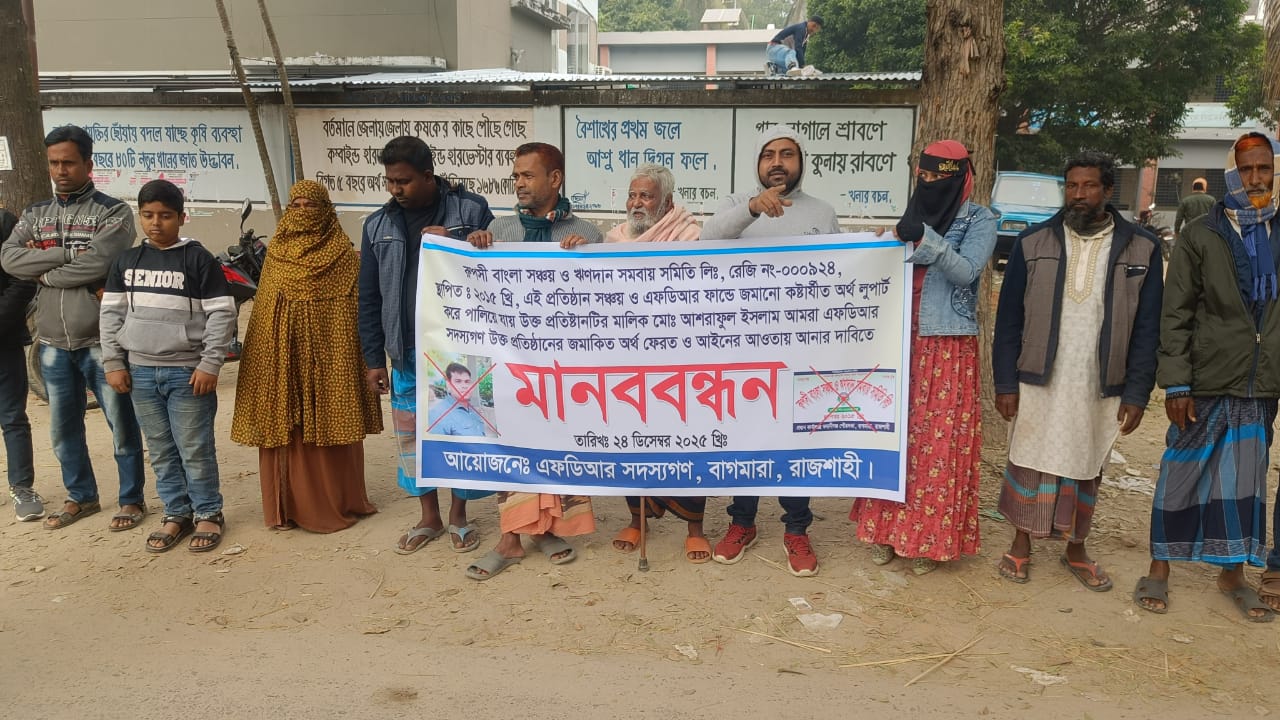 বাগমারায় অর্থ ফেরতের দাবিতে রূপসী বাংলা সংস্থা ও ক্ষুদ্রঋণ সমবায় সমিতি মালিকের বিরুদ্ধে মানববন্ধন